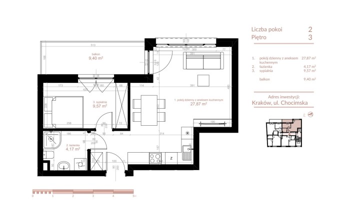 Dodatkową powierzchnią przynależną wyłącznie do tego mieszkania jest duży balkon o metrażu - (9,40 m2)