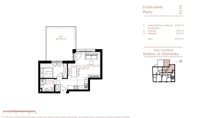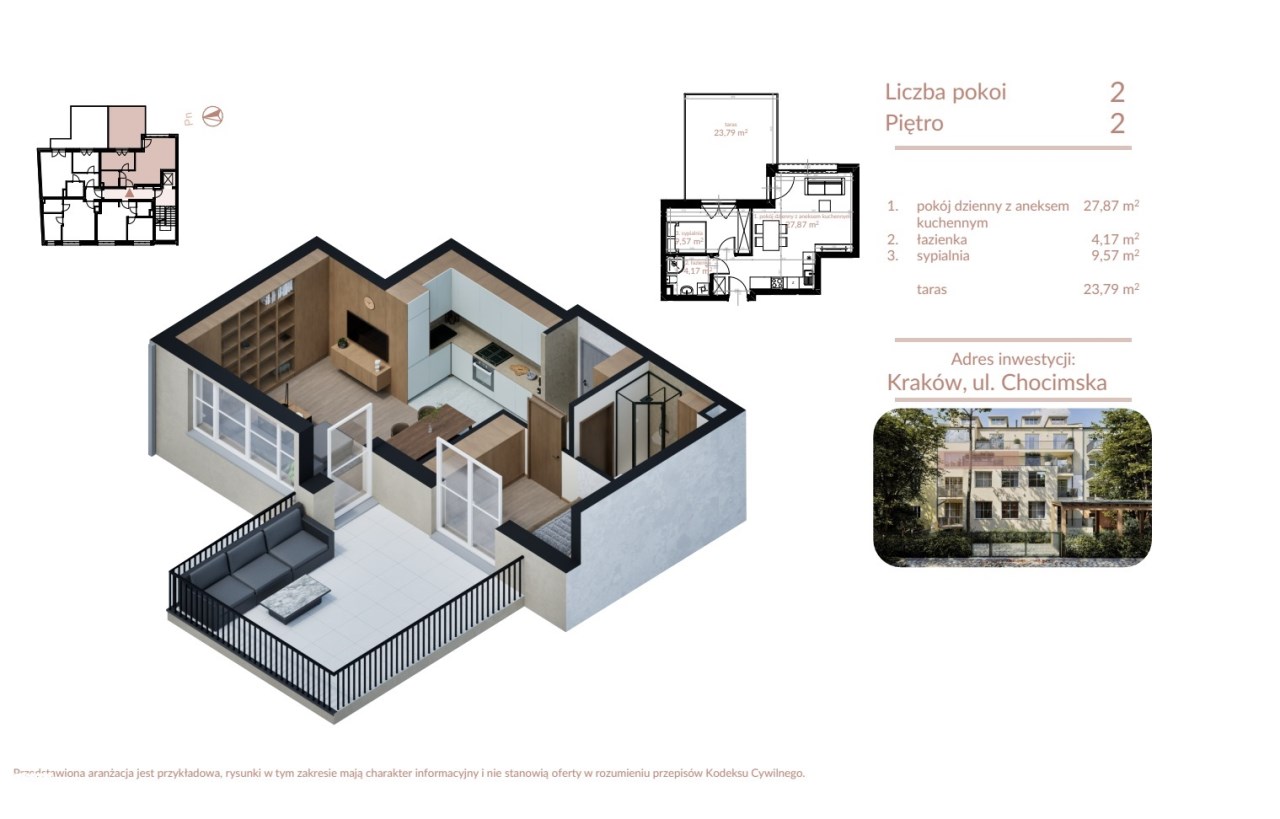 Dodatkową powierzchnią przynależną wyłącznie do tego mieszkania jest duży taras o metrażu - (23,79 m2)