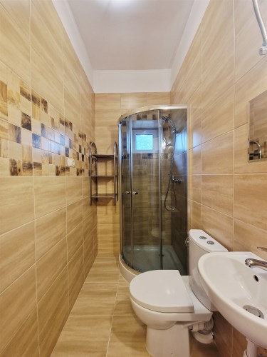 Łazienka to połączenie dwóch odcieni płytek. Łazienka wyposażona w prysznic oraz okno z widokiem na podworzec za kamienicą.