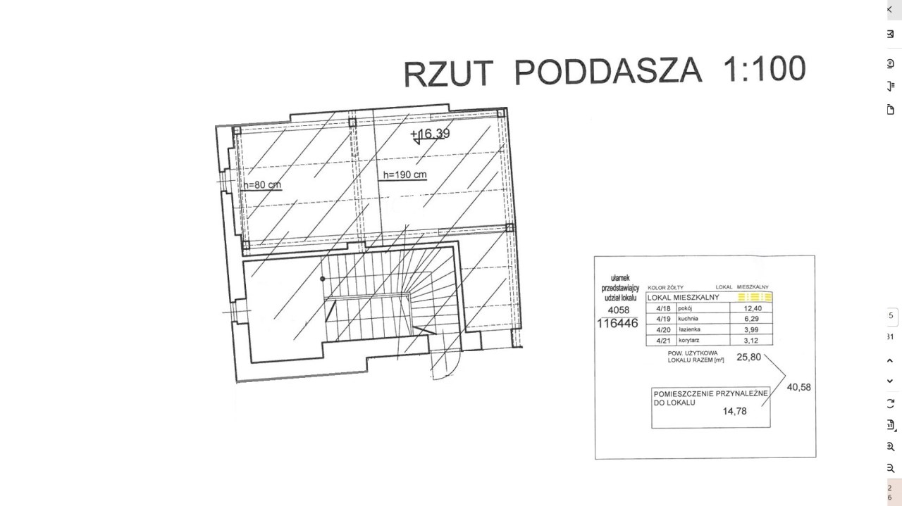 Do lokalu przynależy również strych o powierzchni około 15 m², który stanowi dodatkową przestrzeń z dużym potencjałem. Może pełnić funkcję schowka, pracowni, garderoby, miejsca do przechowywania lub – po uzyskaniu odpowiednich zgód – stać się ciekawym elementem przyszłej aranżacji mieszkania.