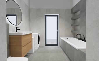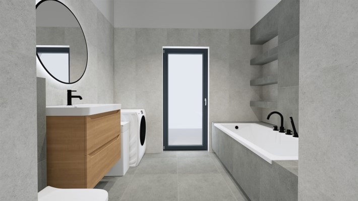 Miejsce na wannę lub prysznic, umywalkę, WC oraz pralkę.