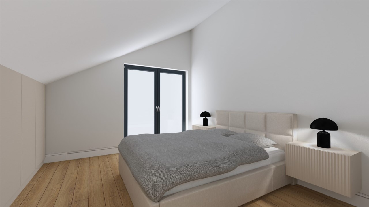 Ustawny pokój z miejscem na duże łóżko, szafę oraz dodatkową zabudowę.