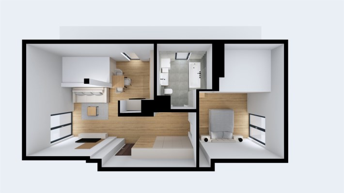 Funkcjonalna komunikacja między pomieszczeniami z możliwością zabudowy szafy wnękowej.