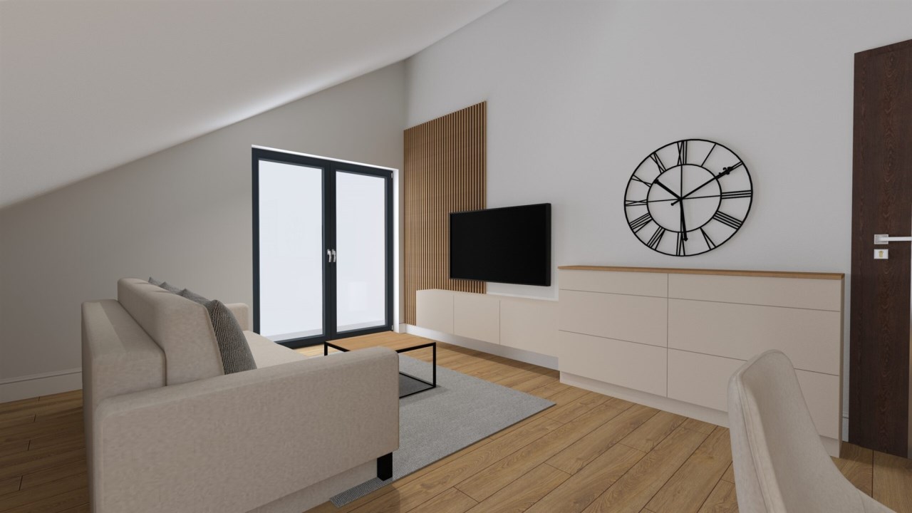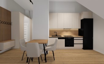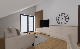Przestronna część dzienna z miejscem na strefę wypoczynkową, jadalnię oraz aneks kuchenny.