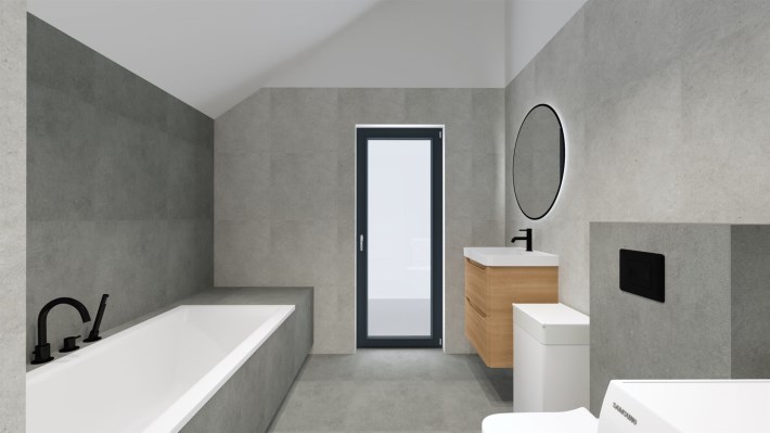 Miejsce na wannę lub prysznic, umywalkę, WC oraz pralkę.