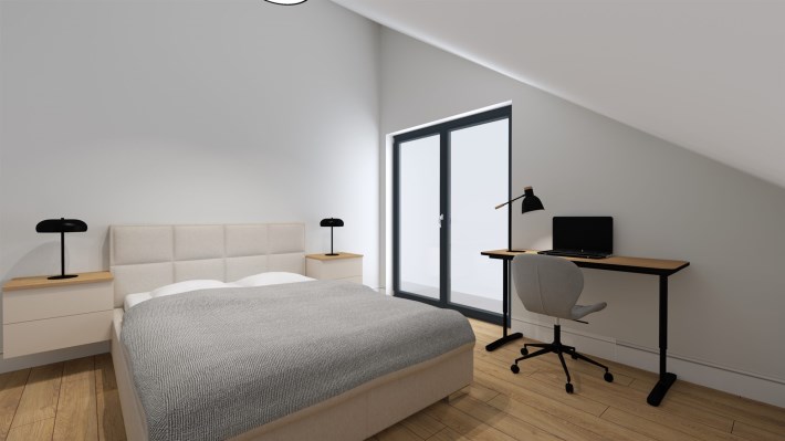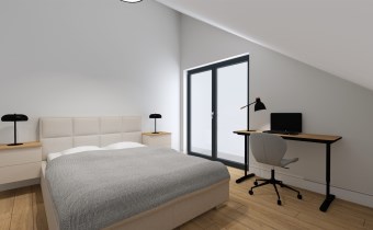 Ustawny pokój z miejscem na duże łóżko, szafę oraz dodatkową zabudowę.