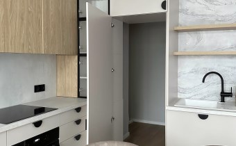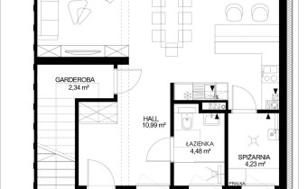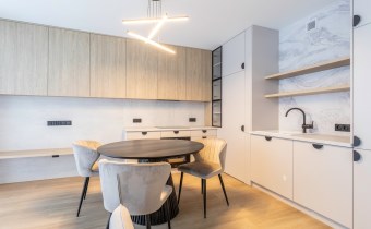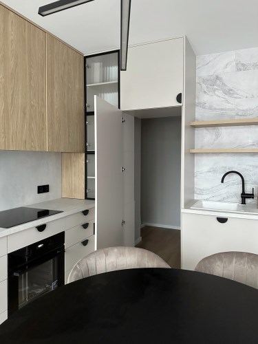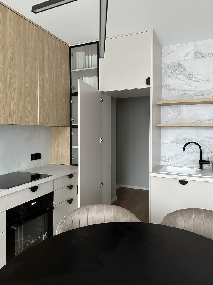 Kuchnia w pełni wyposażona jest w wysokiej jakości sprzęty AGD a blaty firmy Kaindl są wyjątkowo odporne na uderzenia, ścieranie i działanie światła. Do rzadkości należy pomieszczenie spiżarni które znajduje się za tajemnym przejściem wysokiej kaszmirowej zabudowy kuchennej. Pozwala to na przechowywanie większych zapasów poza zasięgiem wzroku użytkowników strefy dziennej.