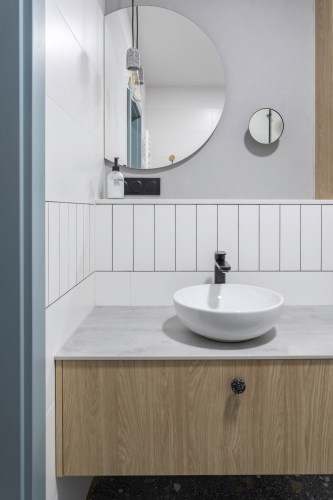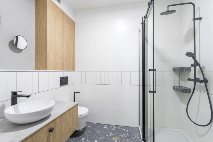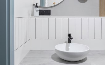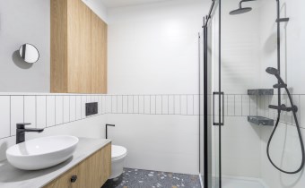 W łazienkach doceniono Polską fabrykę Stargres. Zakupione poprzez Krakowski salon Max-Fliz wzór Terazzo, który w połączeniu z ponadczasową bielą tworzy praktyczne i eleganckie wnętrze.