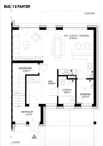 Projektanci zadbali o niecodzienną ilość miejsc do przechowywania w postaci szaf, garderoby, schowków co pozwoli na utrzymanie porządku bez konieczności dokładania dodatkowych brył wolnostojących.
