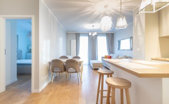 Salon to wygoda na co dzień z dobrej jakości sofą trzyosobową która posiada funkcję spania i pojemny schowek na pościel. W salonie znajduje się również telewizor z dostępem do nagłośnienia i do Internetu poprzez bezprzewodowe łącze Wi-Fi.