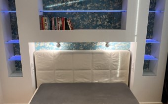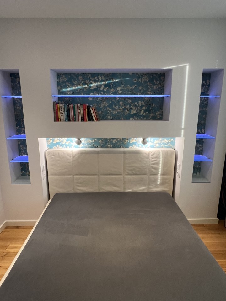 - indywidualnie zaprojektowana ściana z karton gipsu z podświetlanymi (LED) półkami,