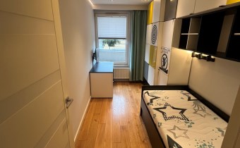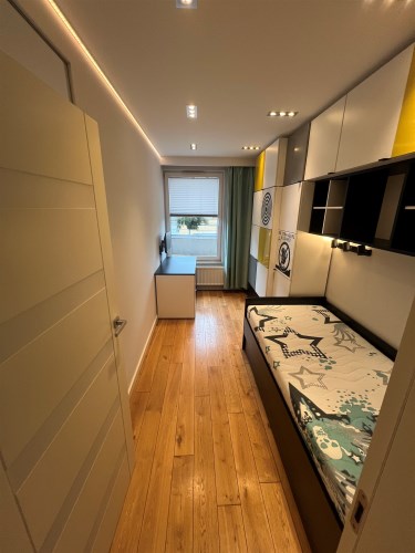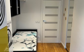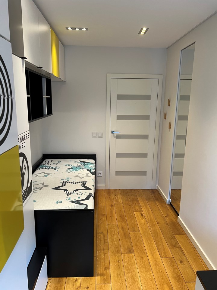 Kolejna sypialnia to pokój (raczej) jednoosobowy. W bliskiej odległości od pokoi znajduje się praktyczna i pojemna mini garderoba/składzik.